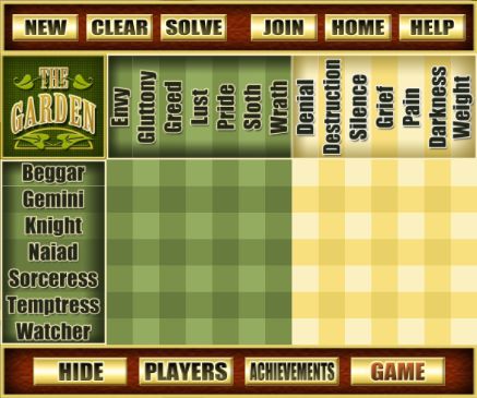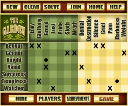 Once a player believes that they have correctly identified the sin committed and penance paid by each of the Guardians and have indicated them on the puzzle grid with a circle each (crosses play no part in the final solution, but are purely there for guidance), they can click the SOLVE button.