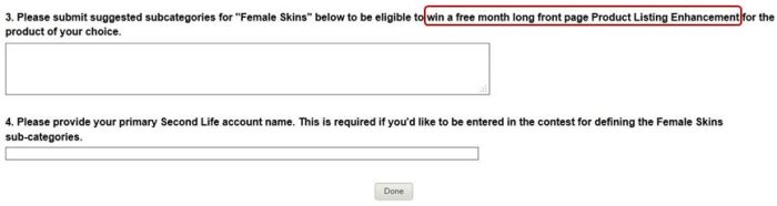The really cynical might even see this as a sideways attempt to try to boost flagging listing enhancement revenues due to all the billing cock-ups in that department over the last 12 months by directly (and repeatedly) linking the cash prizes on offer with the idea of a monthly listing enhancement (see the quote from the blog post announcing the competition above, with the contest rules further pointing out, “Each winner will receive L$2,899 (the cost of a month long [sic], front page featured Product Listing Enhancement on the Marketplace)”, with the survey form itself outright (and confusingly) stating the prize actually is a month-long product listing enhancement (part 3 of the survey).