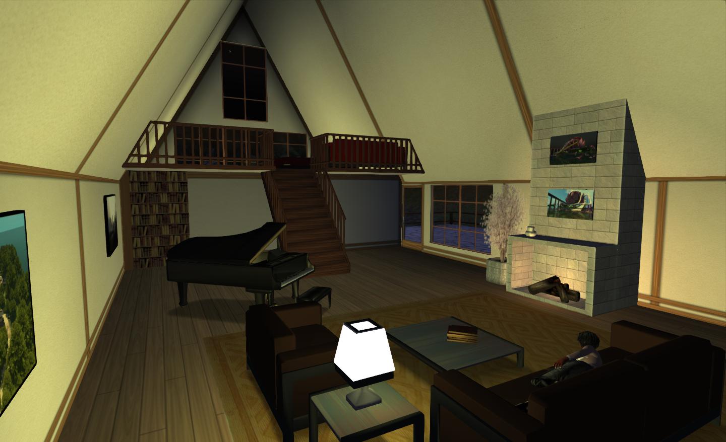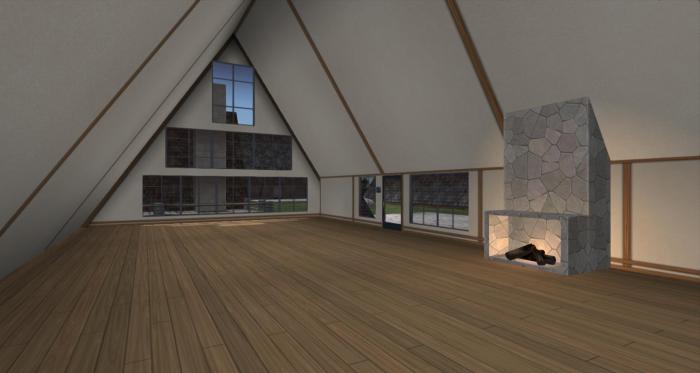 I opted for the Aspen in the Tahoe range. It’s one of the “long” versions of these A-framed houses, and the only one with the front door in one of the long walls, something I particularly wanted. After moving in, I did do a small amount of conversion – I installed a second vertical wall in the place so I had room to hang pictures and added a basic loft area at one end of the house to make space for a (never used) bedroom (do avatars dream of electric sheep?) – but other than that, didn’t really do that much with the place beyond slapping in some furniture.