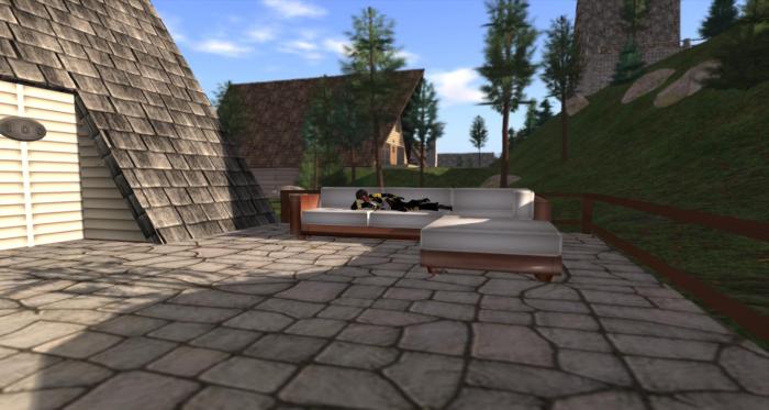 Another reason I like the Aspen is that it has a decent patio area, so there’s room for me to entertain outdoors and enjoy the late afternoon Sun. The railings on the patio are mine – but again only amount to 1 prim.The patio also comes in handy for rezzing purposes as well.