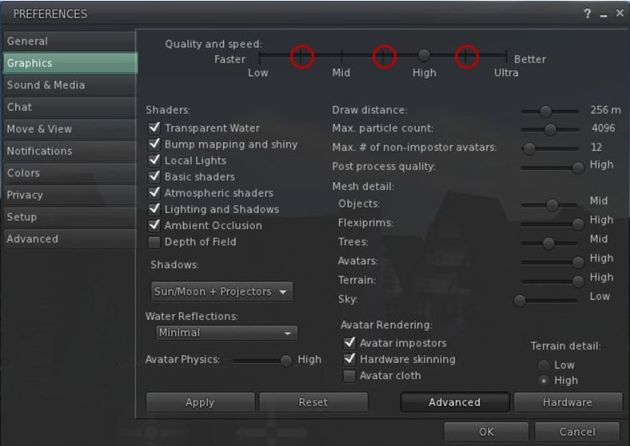 With reference to viewer rendering as a whole, Runitai Linden has been working on the viewer’s rendering system for some time now. This work has included improvements to GPU support within the viewer, with both further graphics cards added to the GPU table (which is used to define the default graphics setting for a viewer when you first run it) and the removal some of the generic “catch-all” options from the table (such as all unrecognised nVidia cards being detected as nVidia Ion GPUs), and so on. Additionally, the graphic settings with the viewer preferences have been updated to allow a greater granularity of settings.
