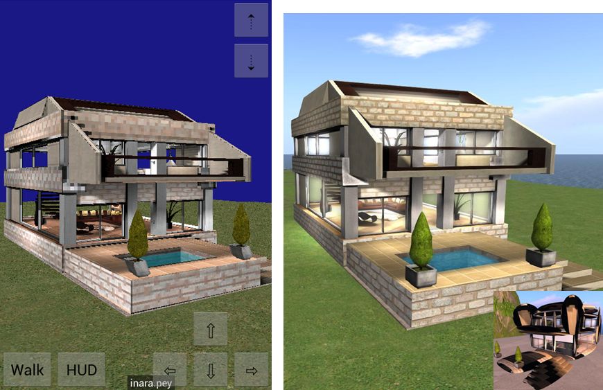 A partial mesh house rendered in Lumiya (l) and a mesh enabled viewer (r). The inset images shows the hows as rendered in a non-mesh viewer