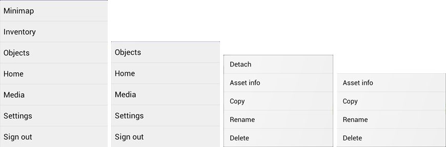 RLV in Lumiya: in the left two images, the 3D world view Settings menu showing how active RLV restrictions remove options (Inventory, Minimap) from that menu. On the right, two images showing the removal of the Detach option from the object menu for an item “locked” via RLV