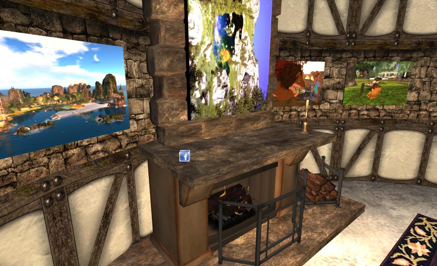In the image below, I am standing 180m from the mantelshelf and have again cammed-in. However, because the server considers my camera to only be 128m from my avatar (and thus some 52 metres away from the fireplace), the “Facebook cube” is no longer rendered, as it level of detail is too low to be accurately calculated by my viewer.