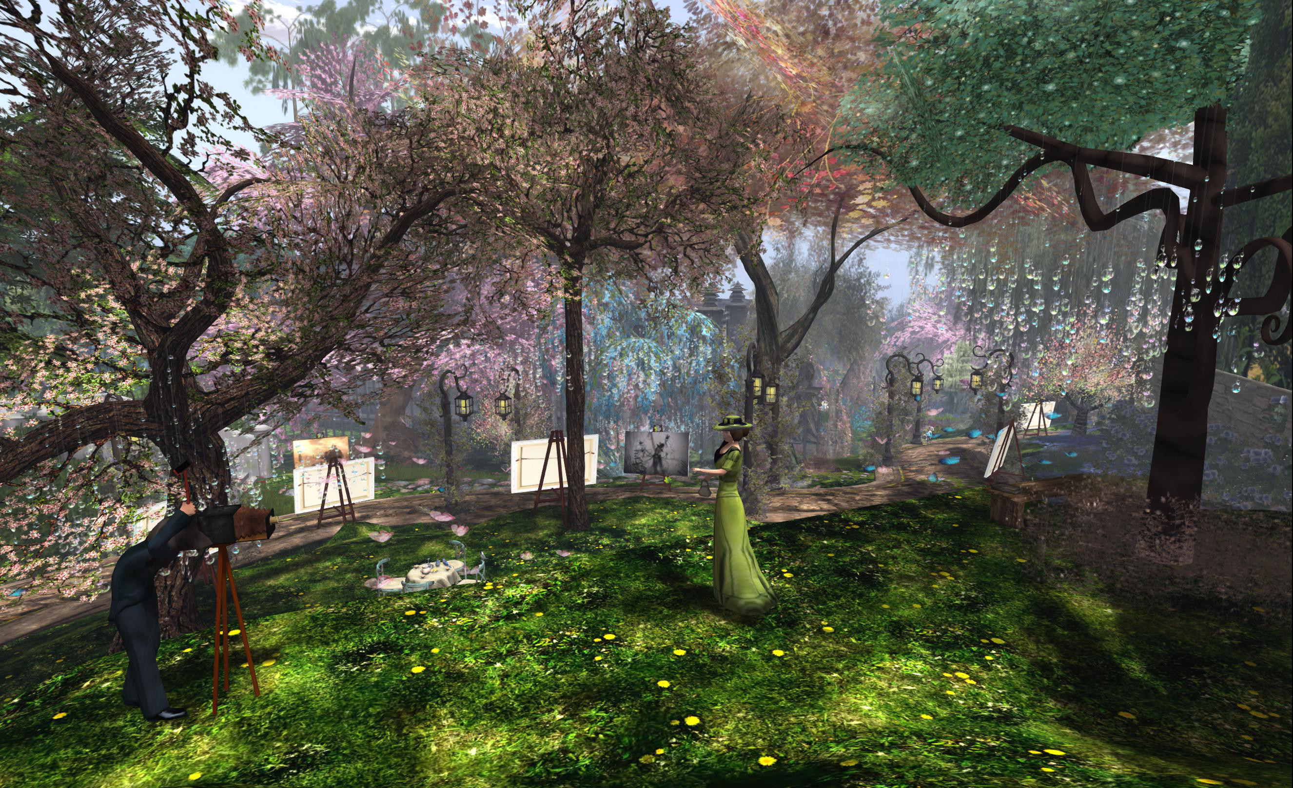 The parcel, occupying the greater part of the region, is operated by the Wanted Dead or Alive group / Jilla Lamar, and features the Beguiled Studio (somewhat in need of repair) and the Beguilded Gallery. Between and around them sit the most verdant of gardens, with paths, cobbled trails, gazebos, water, butterflies and more, populated by nymphs, children and Victorian gentlefolk out for a stroll or fiddling with those new-fangled photographical devices.