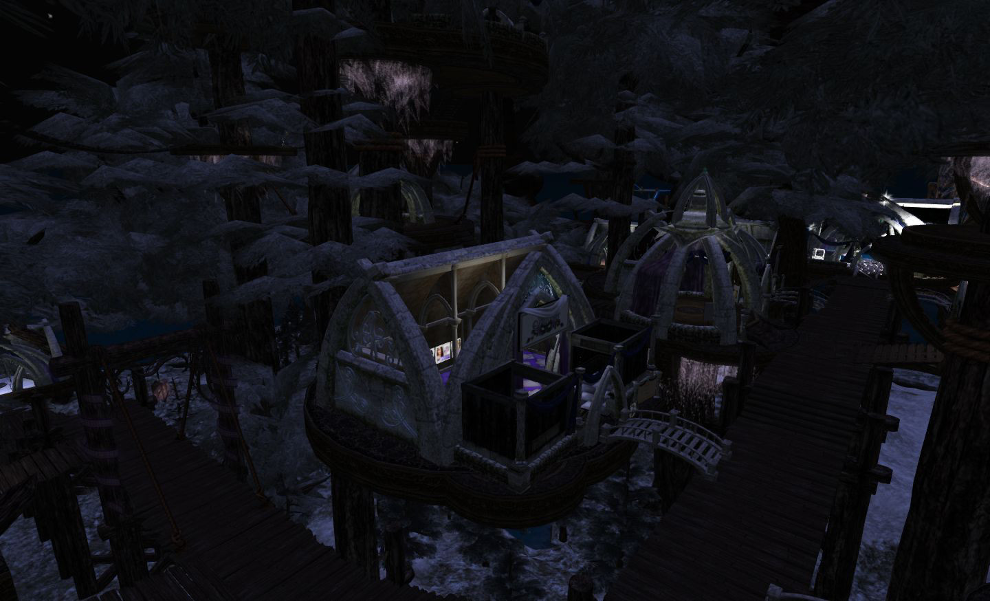 “Resting in the treetops of is the elven enclave of Yuale Nura. Bathed in moonlight, the homes glow warm in the deep blues and purples of a winter’s night. A light dusting of snow gives the impression of undisturbed slumber, but perhaps all is not as quiet as first impressions suggest.”