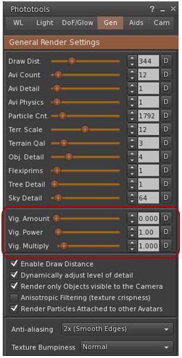 Firestorm 4.4.0 introduces vigetting, courtesy of Exodus, through the General tab on the Phototools floater.  The controls comprise three sliders: