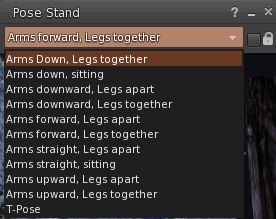 The option is accessed via Avatar > Pose Stand, or via a now toolbar button, and includes a range of pose options accessed from a drop-down list (right).
