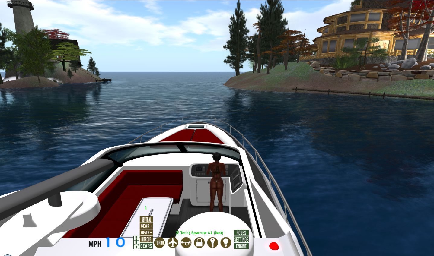 Driving the boat is a matter of rezzing it on a suitable body of water, right-clicking on it to position yourself behind the wheel and they using the WASD keys or arrow keys for the throttle and steering. For those who like running up and down through the gears, PAGE UP and PAGE DOWN provide the gear sift options – UP to move up through the gears, DOWN to move down through them (and to shift to neutral and reverse). For those who don’t like gear changes the boat’s transmission can be set to Automatic via the comprehensive menu system.