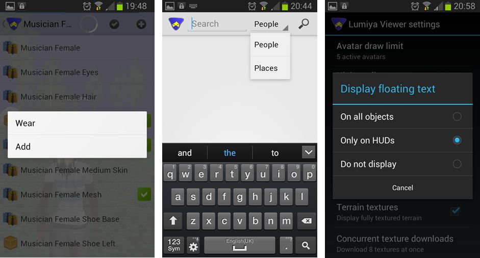 Lumiya now supports emotes in chat (e.g. /me smiles) and will also now display hover text above objects. By default, this is only on for hover text associated with worn HUDs. This is to prevent smaller screens being over-run with lots of on-screen hover text (because you’re roaming through a breedables store, for example). However, it can be enabled for in-world objects (or disabled altogether) by tapping the Menu button on your device and then going to Settings and scrolling down to 3D View and tapping Display floating text. This will display a pop-up menu with three options: On all objects, Only on HUDs, and Do not display – tap the radio button for the desired option.