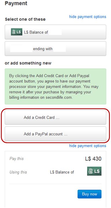 Note: I’m not sure if, after selecting and using an alternative payment option, this becomes your default option for all future payments (and thus appearing the “Using this” section of the Payment box of the Cashier Page. This is because I use L$ for all my Marketplace purchases, and have no wish to use an alternate payment method I have registered with the Lab.