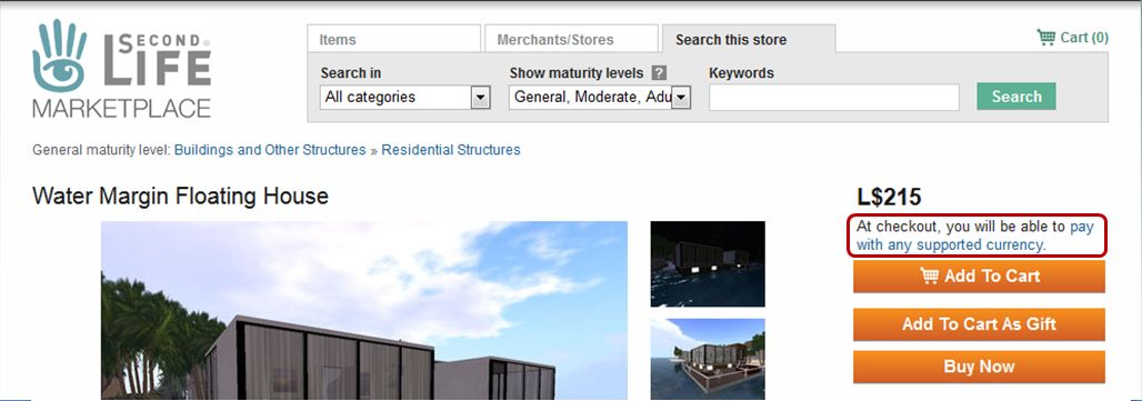 - All items now include a note that “At checkout, you will be able to pay with any supported currency“, directly under the L$ price. The link will display the Accepted currencies and payment methods section of the Billing page in the Knowledge Base, which lists the credit / debit / charge cars recognised by Linden Lab and the currencies in which payments can be accepted using them.