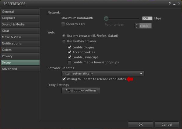 Located in Preferences > Setup, “willing to update to release candidates” (to give the option its full name) is enabled by default. But just because it is, does not automatically mean someone will be selected to test a release candidate viewer. This is because the download quota defined for any given release candidate will always be relatively small when compared to the SL user base as whole.
