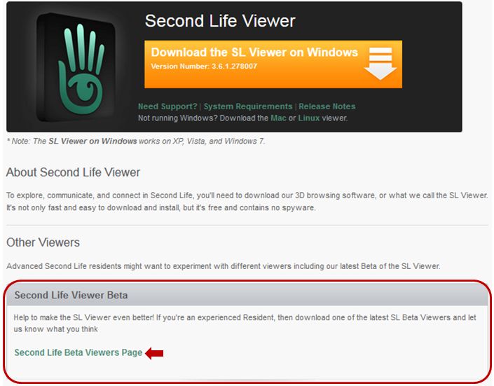 As a result of the move to the new release process, the SL viewer download page has been updated, and there is no longer any link to download the “Beta Viewer”. Instead, there is a link which takes you to the Official Alternative Viewer wiki page, which instead lists all available beta and project viewers.