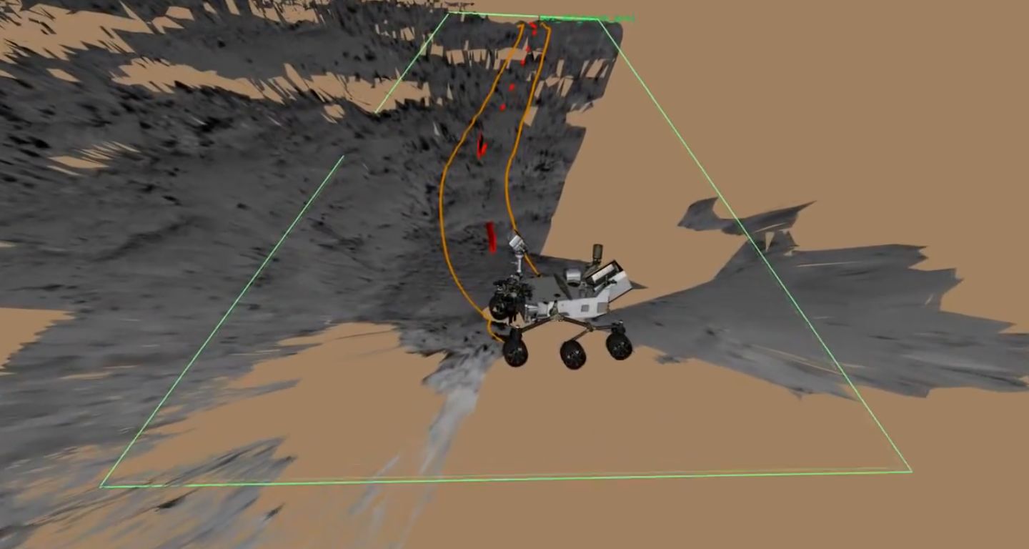 The new drive distance was set on Sol 340 (July 21st), and was made possible by the fact that the rover had previously arrived at a high point overlooking the route ahead, and so mission planners were able to use high-resolution images from the Mastcam and stereo images from the Navcams to plot the drive and note major obstacles. This was uploaded to the rover, which used its updated visual odometry software to ensure it correctly navigated around an area of concern to planners noted in the images.