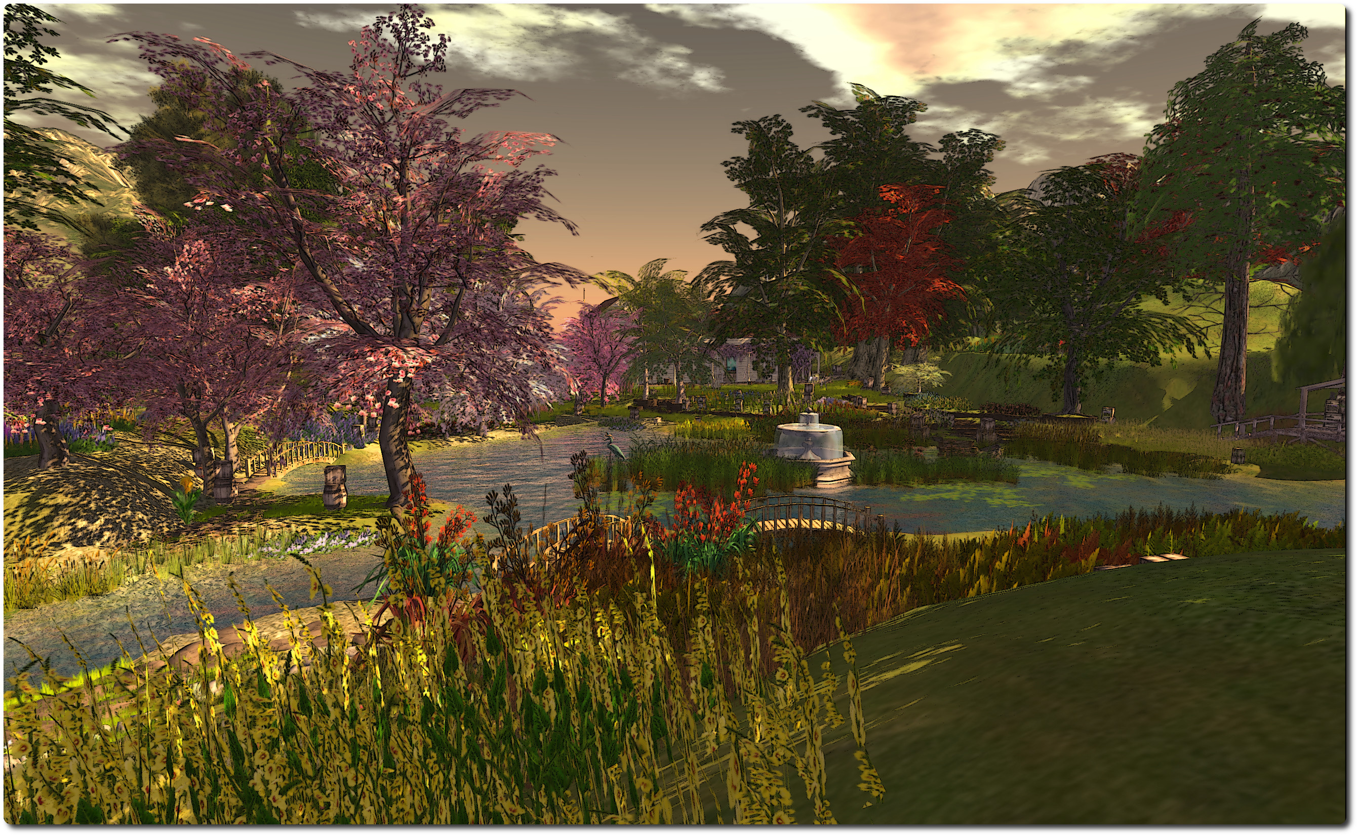 Follow the paths around the island and you’ll find much to delight; places to sit, places to watch the world go by, and places to simply enjoy your surroundings, including a delightful central garden area with a large body of water for the local ducks to enjoy. I do recommend that when exploring, you have in-world sounds enabled; there is a wonderful soundscape to accompany the region.