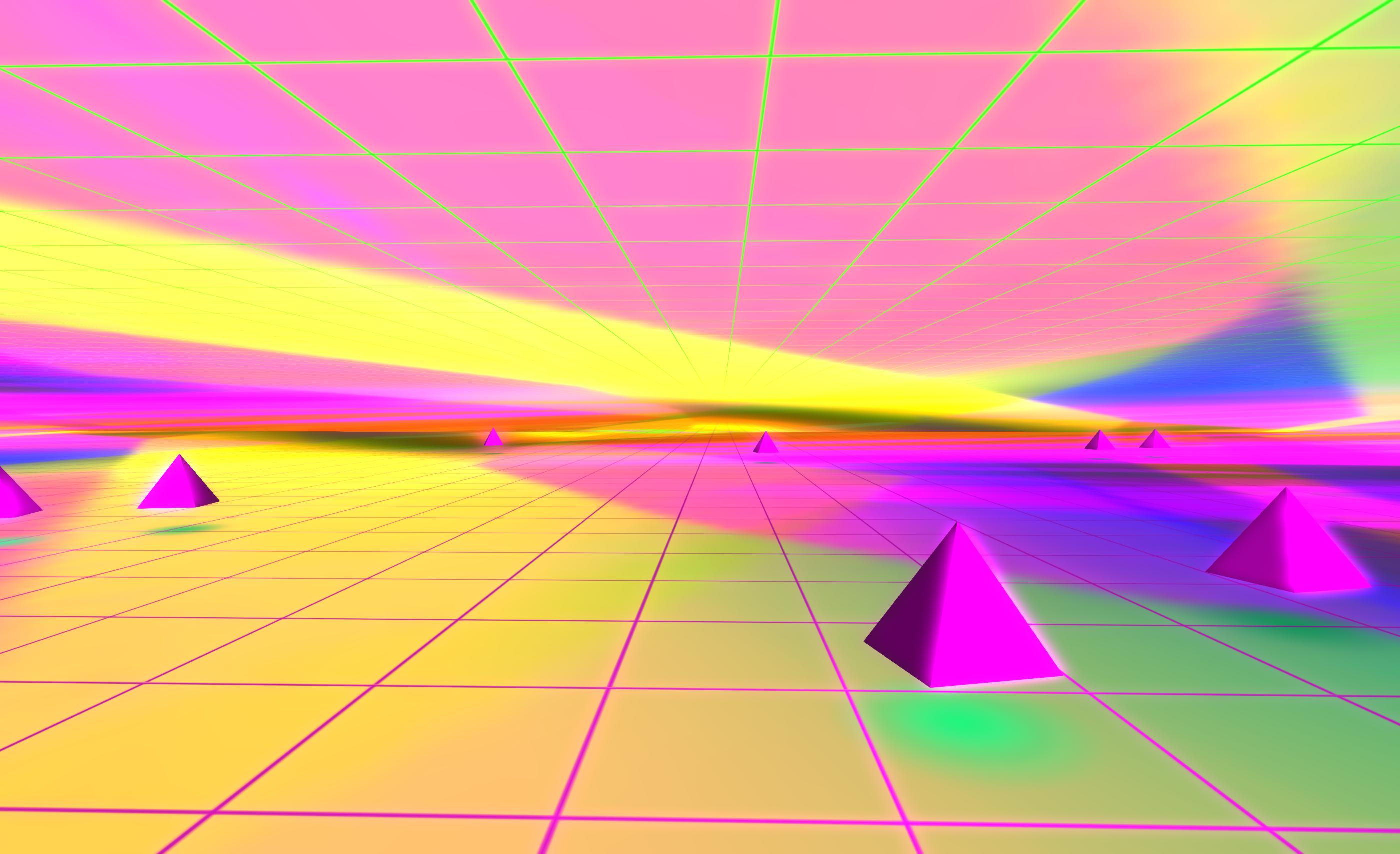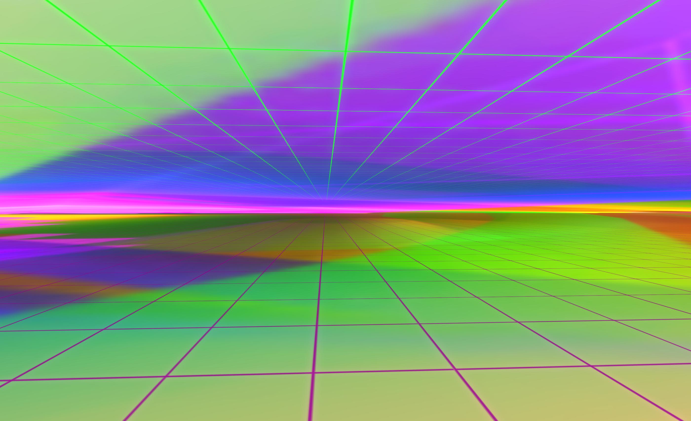 Infinity Space comprises a huge, multi-hued horizontal space overlaid with two grids, one above the visitor’s head and one below their feet, all of which recedes infinitely into the distance no matter where you stand – or how far you walk.