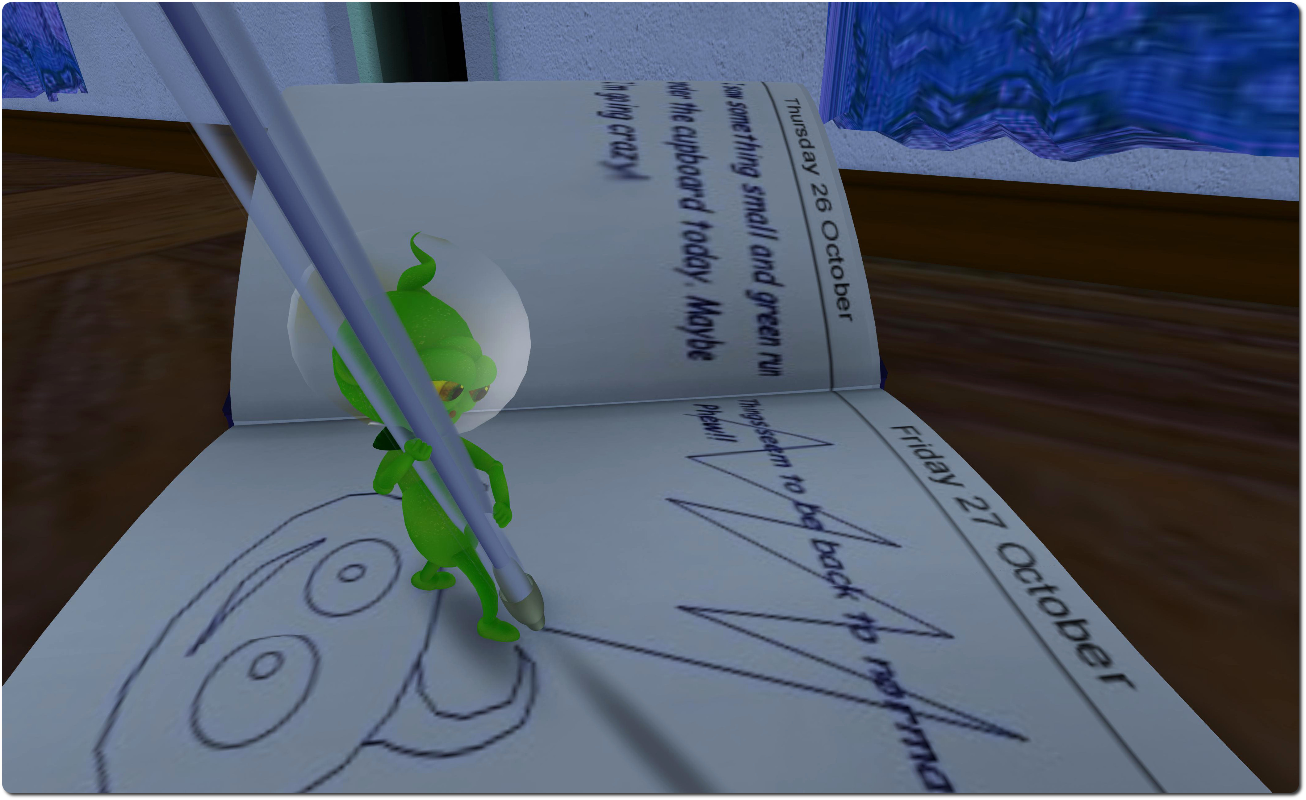 As with the original, the visitor is placed on the scale of the mischievous aliens, who have found their way into a home somewhere on Earth, and who are both exploring it, and setting-up residence in part of it. While the original was set in the 1950s, the home here has been considerably updated: there are DVDs, a boom box, flat-screen TV, CCTV and so on.