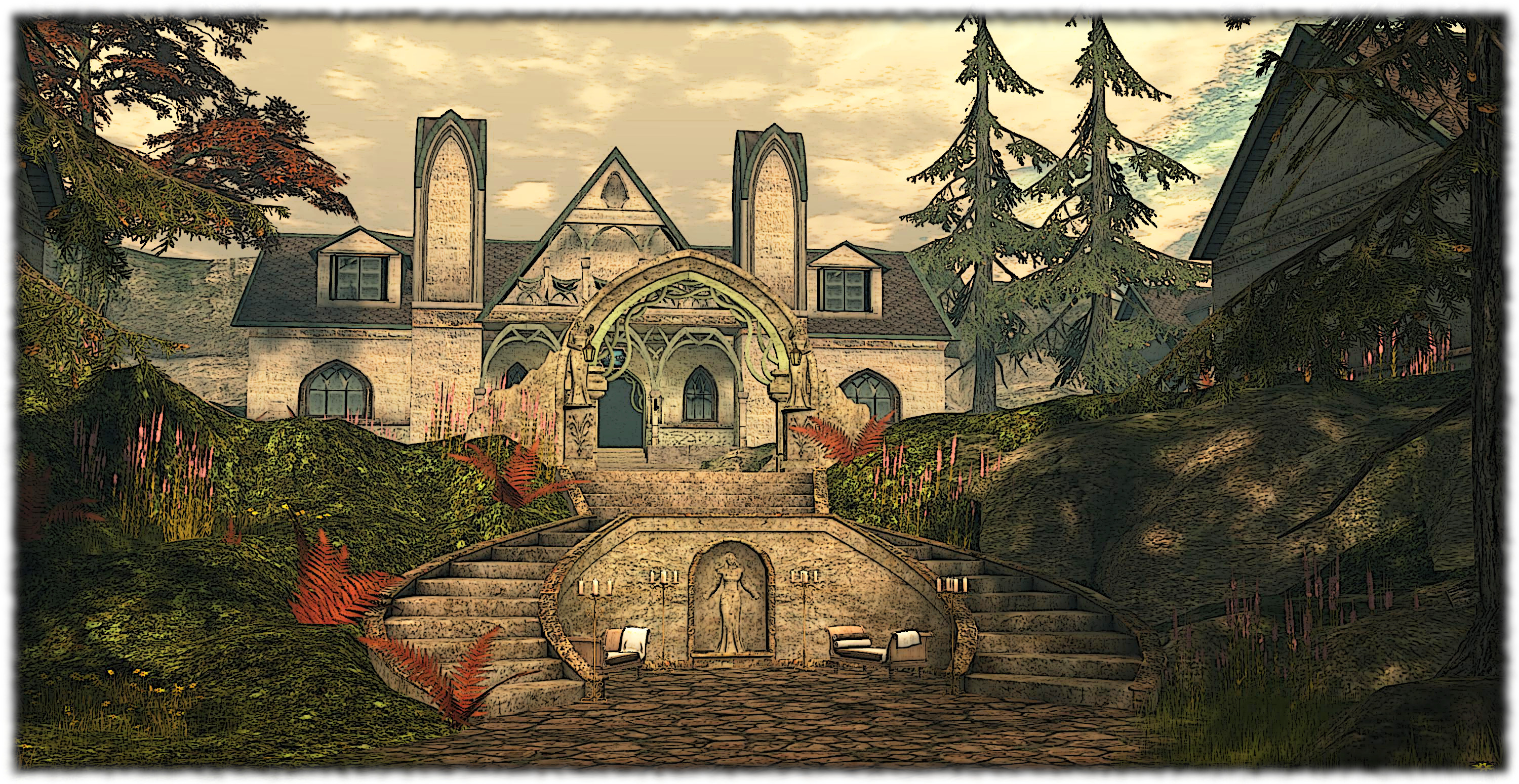 Medhir Woods is an elven outpost protected by the trees of a forest, yet open on one side to the sea. Here is a place of stone and wood, of tree and water, all blended together into a harmonious whole; a place for the wanderer to tarry and where the traveller can seek rest.