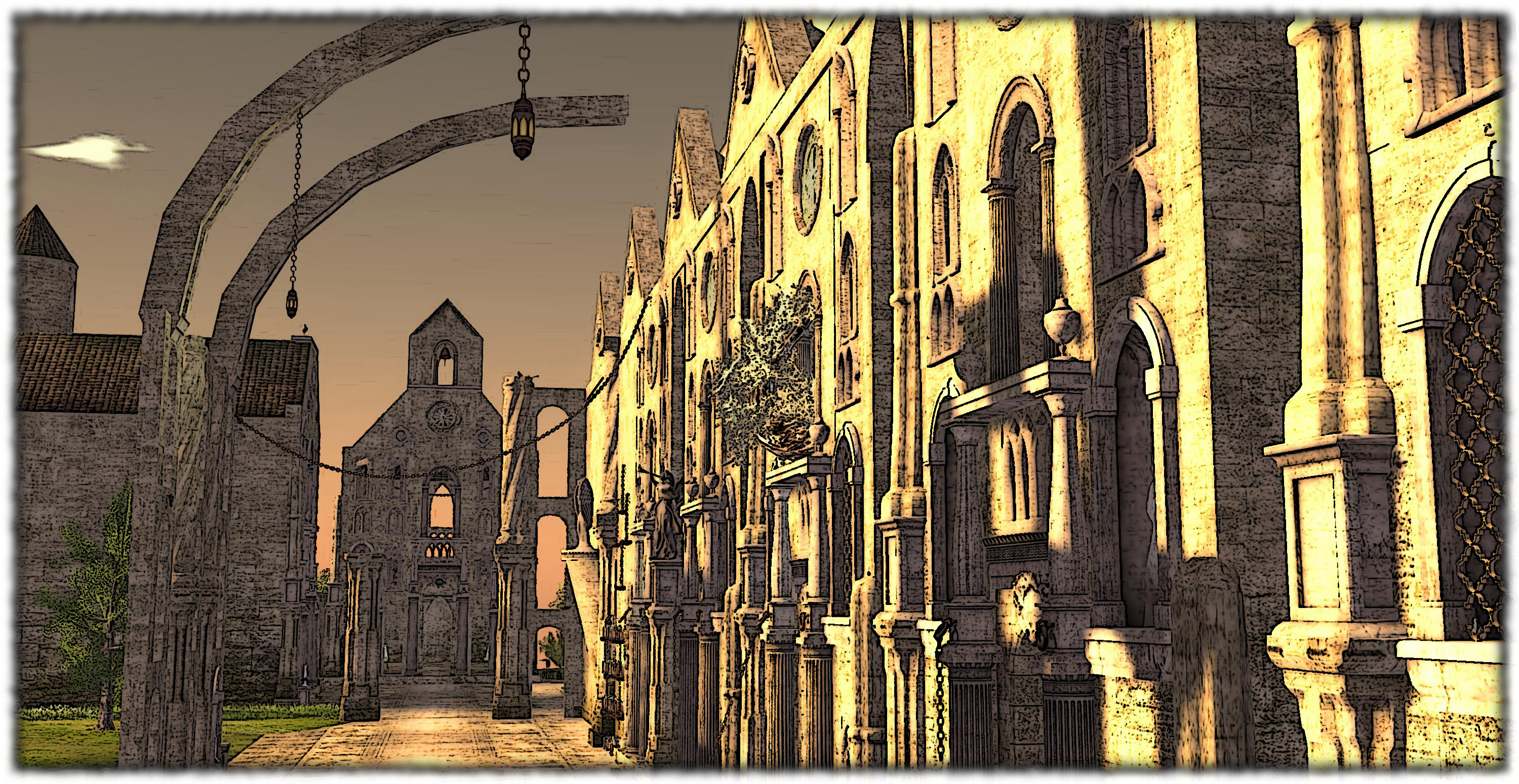 The great isle floats above the surrounding lands, stout chains, eons old, anchoring it in place. It is said this place once stood between Heaven and Hell, a place of worship and respite, the great halls once echoing to prayer and chants. Still Sanctum stands today, rising from the grass of the floating isle, its great stone walls as sound as they were when first raised, while from the rocks upon which they are founded water gushes to feed the lands below.