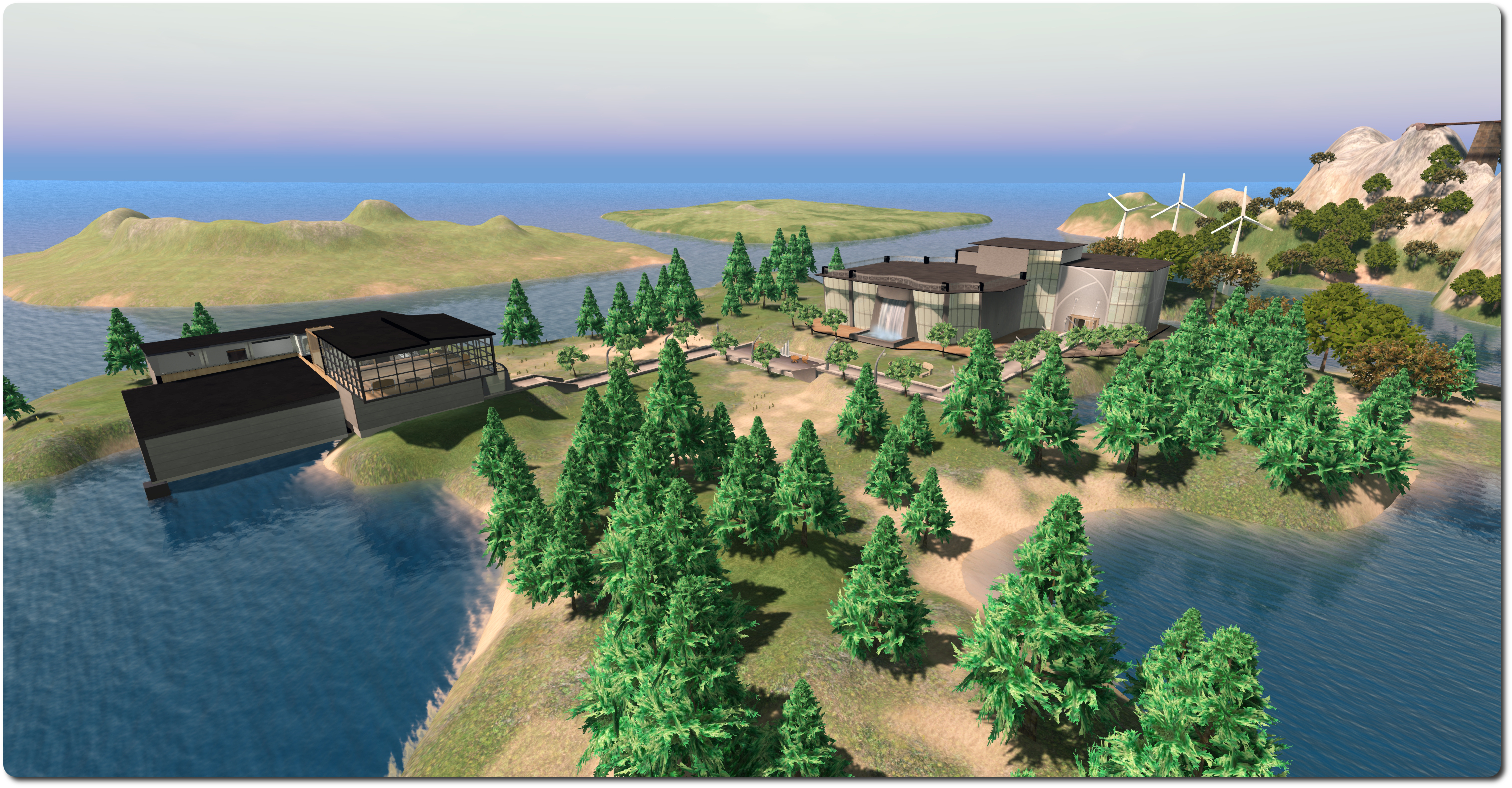 Across from this, the second building offers a reception area, a couple of meeting rooms and an upstairs seating area. One of the meeting rooms has positionable tables. The small offshore venue area offers open-air seating, and the design is finished-off with simple landscaping, non-functional video screens and an offshore wind farm.