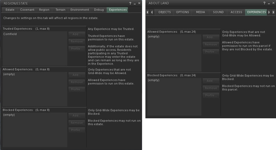 As well as the above, the Region / Estate and About Land floaters in the viewer has also been updated with a new Experiences tab. These allow the landowner to control which Experiences can run on the land by adding them to the correct list: