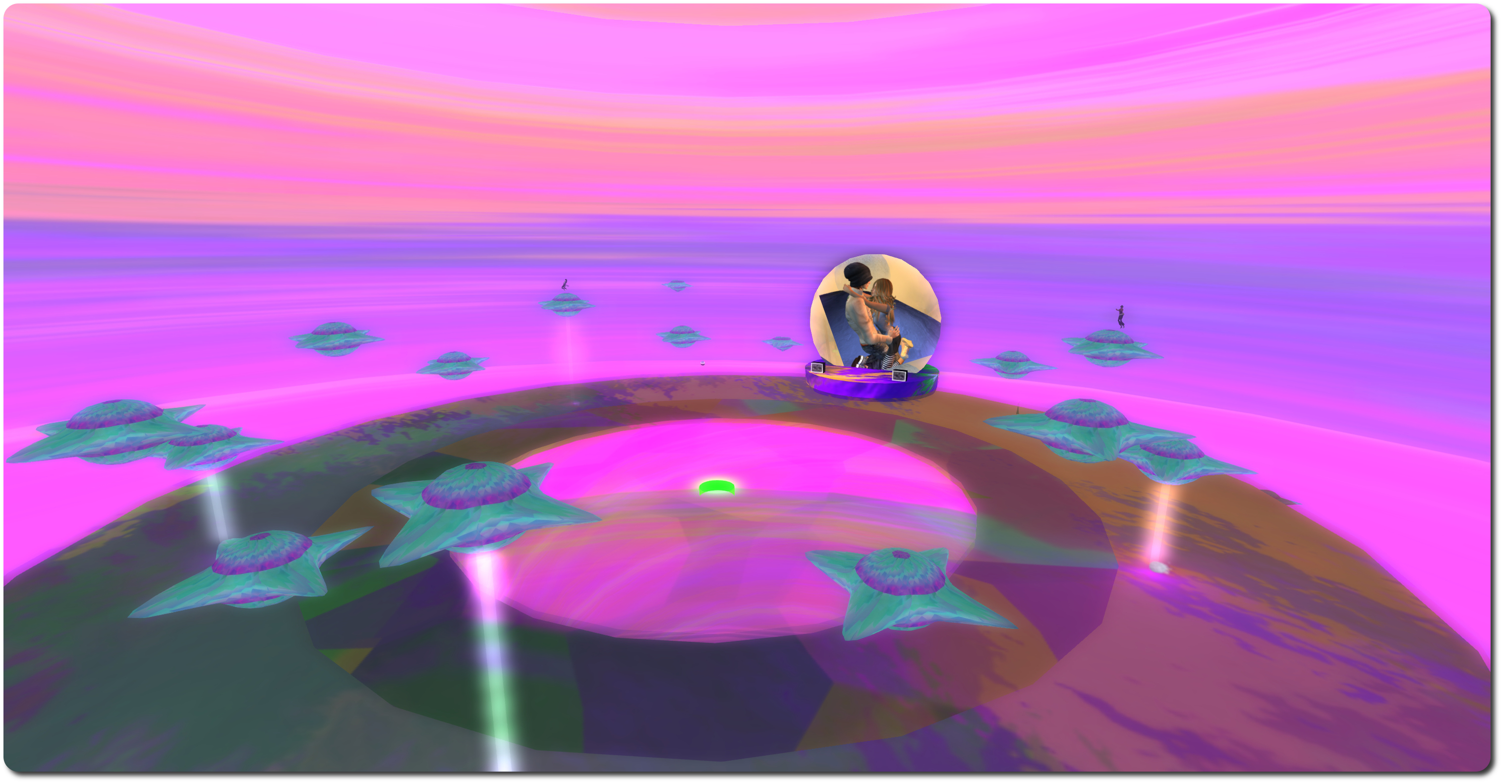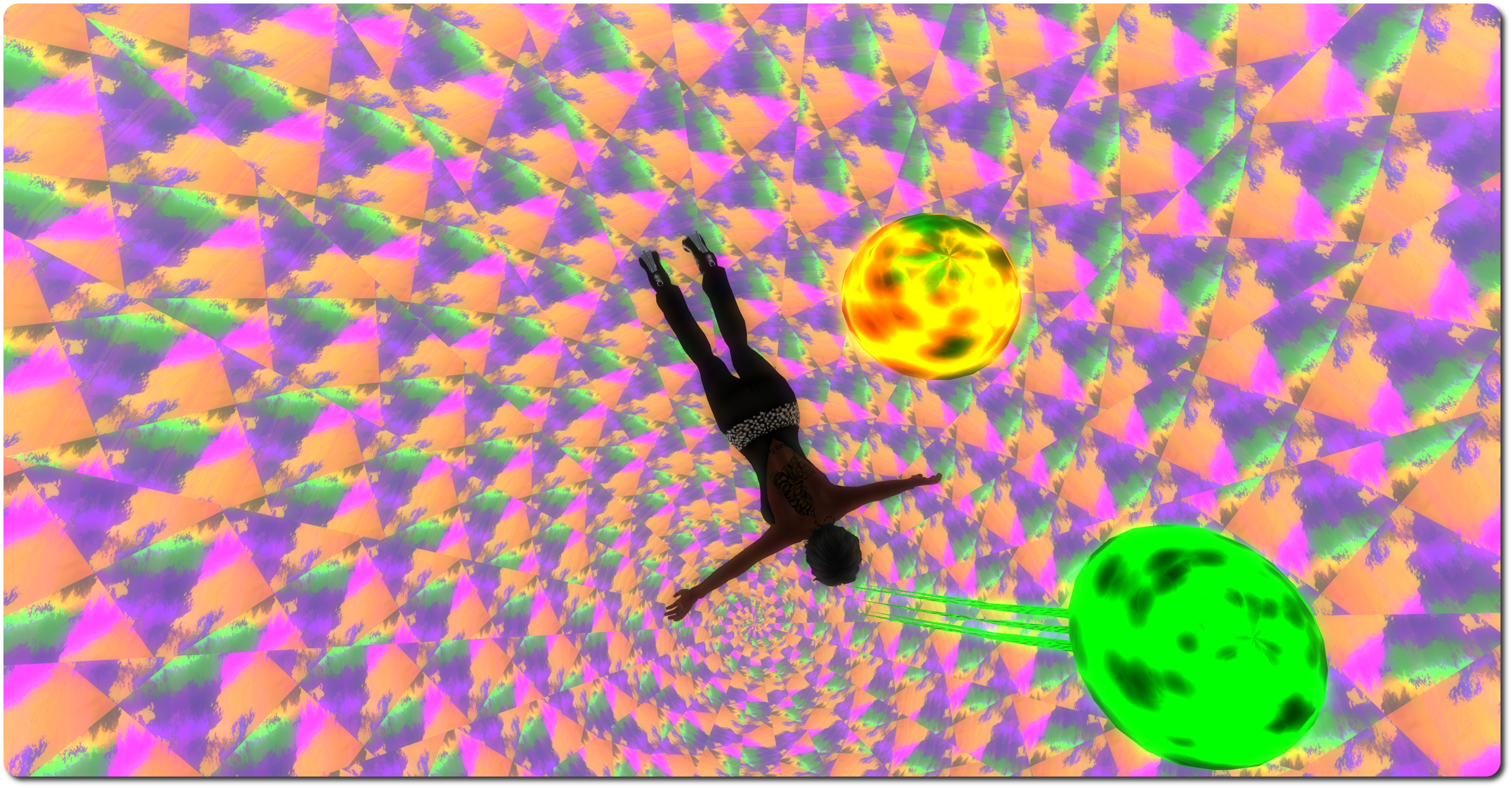 As noted at the start of this piece, defining My Space isn’t easy. The colours certainly give it a psychedelic feel, and the flying saucers, floating jellyfish, dancing on a rotating, spinning gold disk in defiance of gravity, certainly add to the “trippy” feeling one gets. This feeling is perhaps further enhanced when parachuting through the centre of the cones on your way back down (particularly if you aren’t showing your avatar when in Mouselook and you’re not wearing any mesh), when the colours can become somewhat entrancing as they drift and spiral by.
