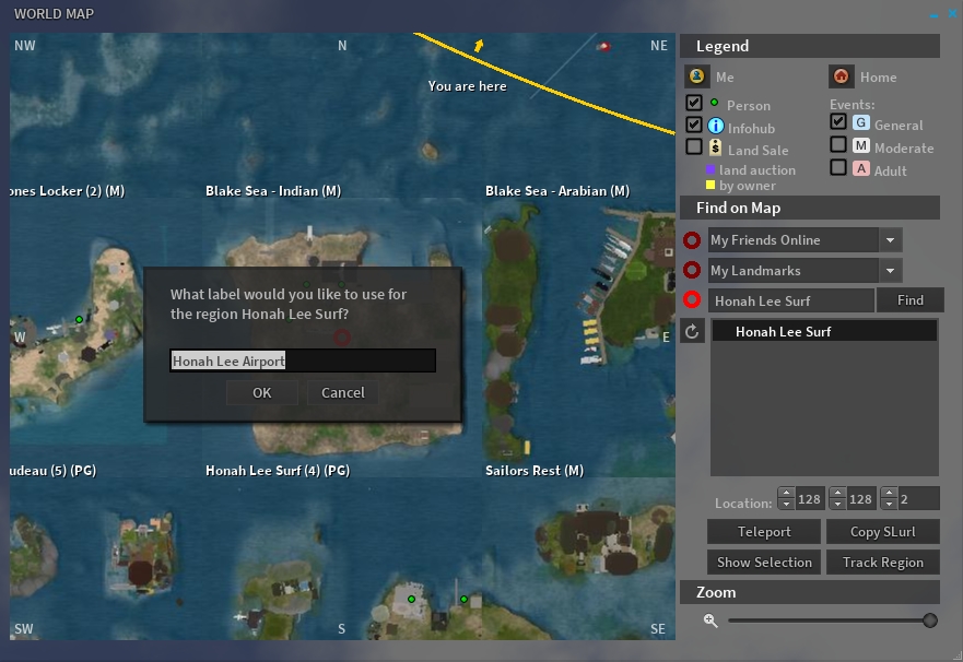 Regions are added to the floater by opening the world map, locating them via Find, and then clicking the Track Region button. This will display a dialogue box allowing you to add a label for the region. Clicking OK in the dialogue box adds the region to the Tracker.