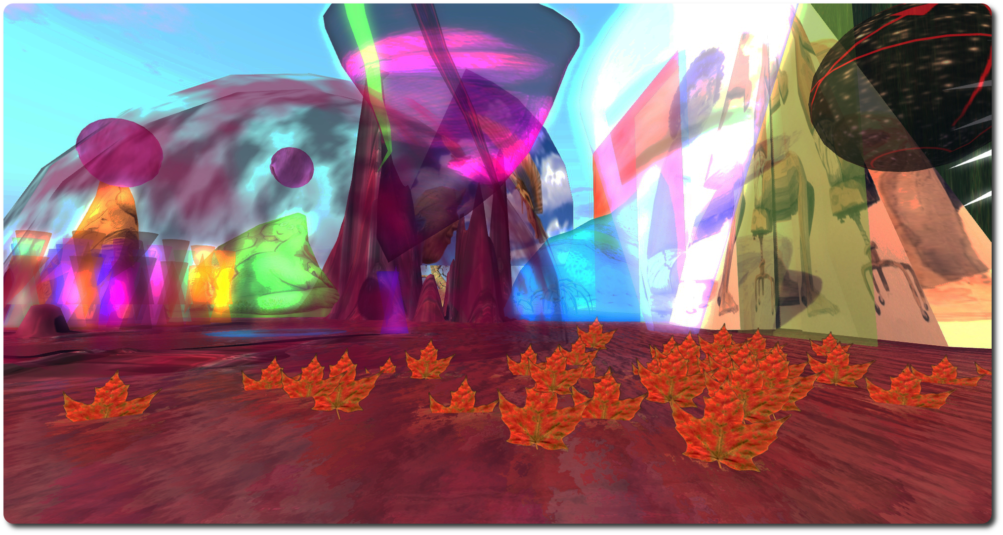 Mario says of the installation, “the textures in the 3D prims, were derived from a process of automatic drawing. I used color or scribbles to create a texture or area and then allowed the images to arise. These are images that I have “drawn” from my imagination, the feedback from a lifetime of studying while I enjoyed cartoons, comic books, illustration and academic drawing. While building the installation here I had my avi walk around to get the walking point of view and perspective. My goal is to share and convey, in the form of an immersive visual environment, the unknown, undocumented and unmeasured language of art.”