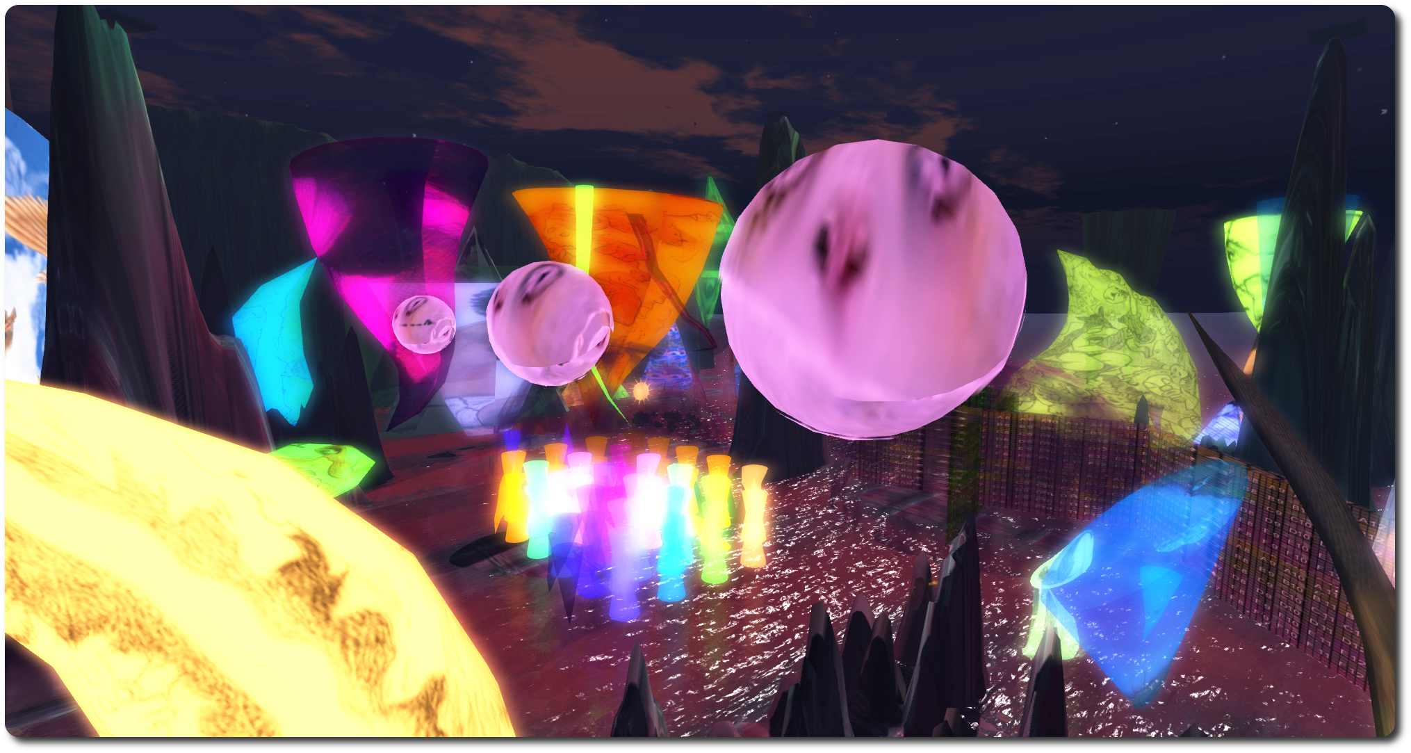 The result is certainly colourful, and does require a fair amount of camming around to see. The region is filled with prims, some flexi, some static, some of which display static images, others moving images, some of which have glow applied, and so on. In terms of potential appeal, however, I’m really not sure how this installation will strike people. Perhaps we’ll only be able to really make a determination once all the levels have been added and, as Mario promises, the title of the piece becomes evident as they arrive.