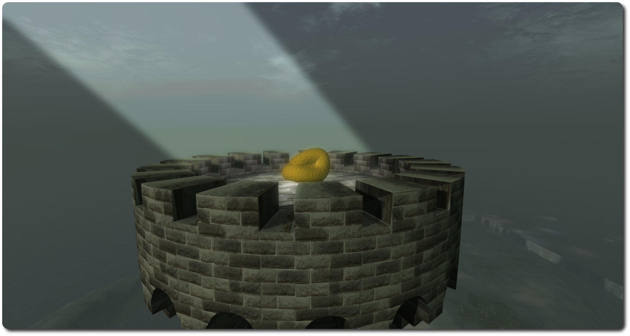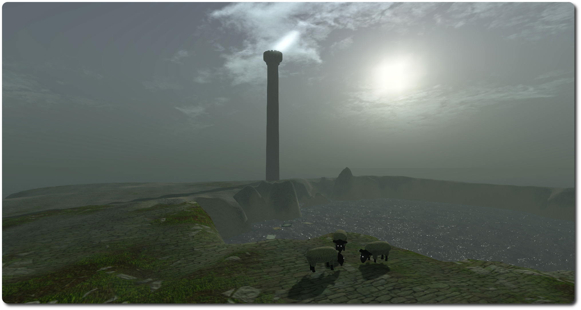 The sheep stand on a barren landscape enclosing, quarry-like, a body of water and shrouded in an evocative, misty windlight. A single stone tower rises from this landscape, while four transparent prims located to one side of the land offer a sound scape of crowd noises. At the top of the tower, celestially spotlighted sits … a turd, while down just above the water (and below it, for those who look) are images of the artist’s real-life abstract art.