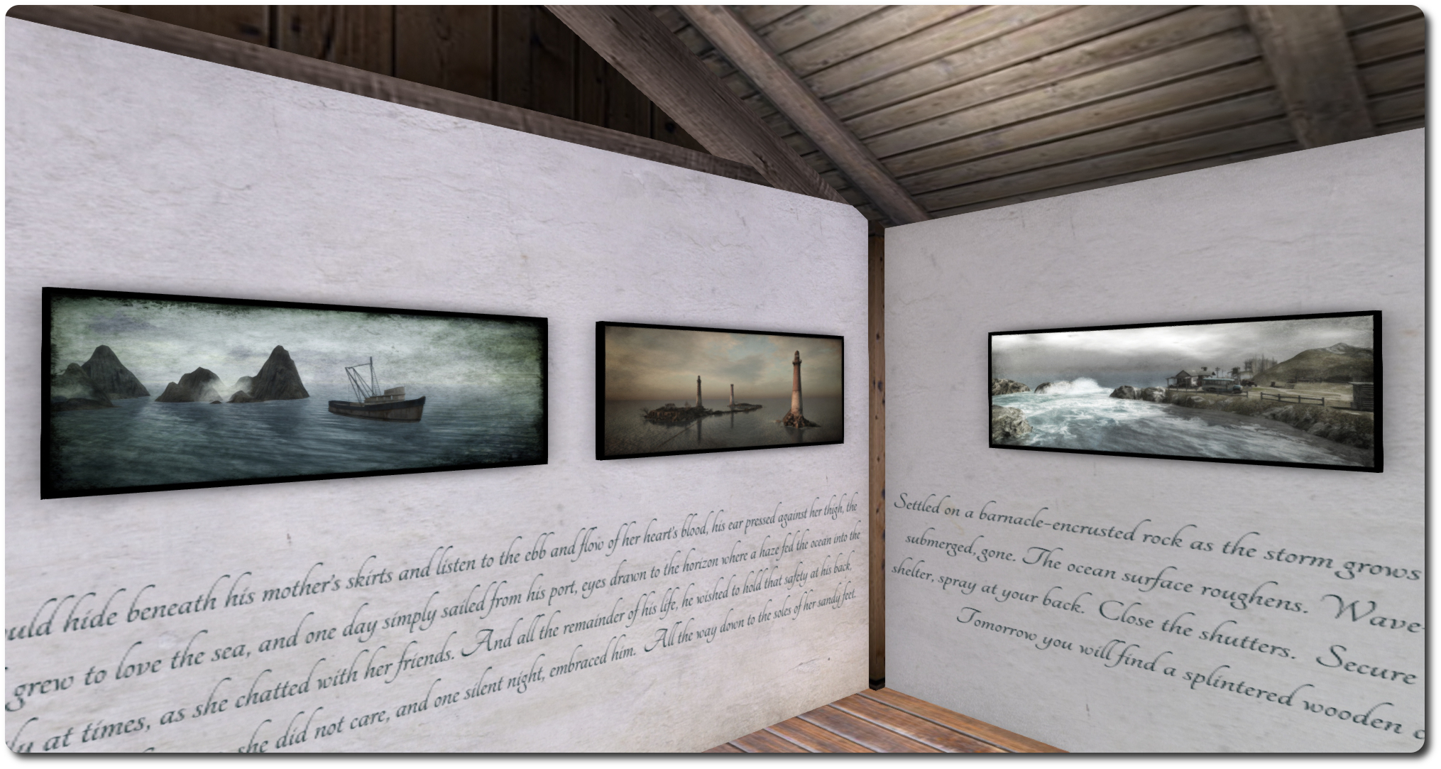 Featuring famous locations such as Roche, Hazardous, The Colder Water, Nagare and Frisland, and arts locations such as Imagin@rium and Immersiva, these pictures are as beautifully composed as the real-life images on the ground floor; in fact I’d say without a shadow of a doubt that they are among the finest images I’ve seen captured from within SL. To call them exquisite would not be over-emphasising them at all.