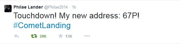 The actual touch-down was expected to take place around 15:35 UT, or shortly thereafter. However, because of the distance involved, it would take the signal confirming touchdown a further 30 minutes to reach Earth. At 16:11 UT,the first telemetry showing Philae had landed was received by mission control in Darmstadt. It promoted a Tweet from the Rosetta media team: