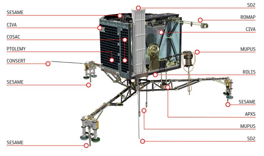 As it turned out, the initial contact between the lander and the comet confused several of Philae’s instruments into “thinking” it had in fact landed, causing them to activate. These included the ROMAP magnetic field analyser, the MUPUS thermal mapper, the CONSERT radio sounding experiment and the SESAME sensors in the landing gear. Data received from these instruments, arriving on Earth some 30 minutes after initial contact with the comet, and the information which followed, help alert mission staff that something had gone wrong, and enabled them to subsequently piece together the events that occurred during the landing sequence, while the instruments continued to gather data and transmit it back to Earth via Rosetta.