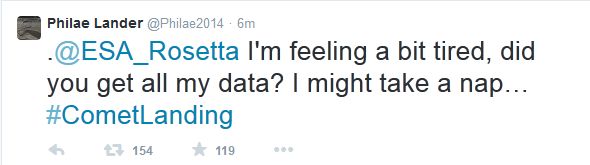 As it turned out, contact was re-established at around 22:30 UT, and the Lander commenced transmitting data on its operations – including confirmation that the drill had successfully gathered samples from the comet and that they had been delivered to COSAC.