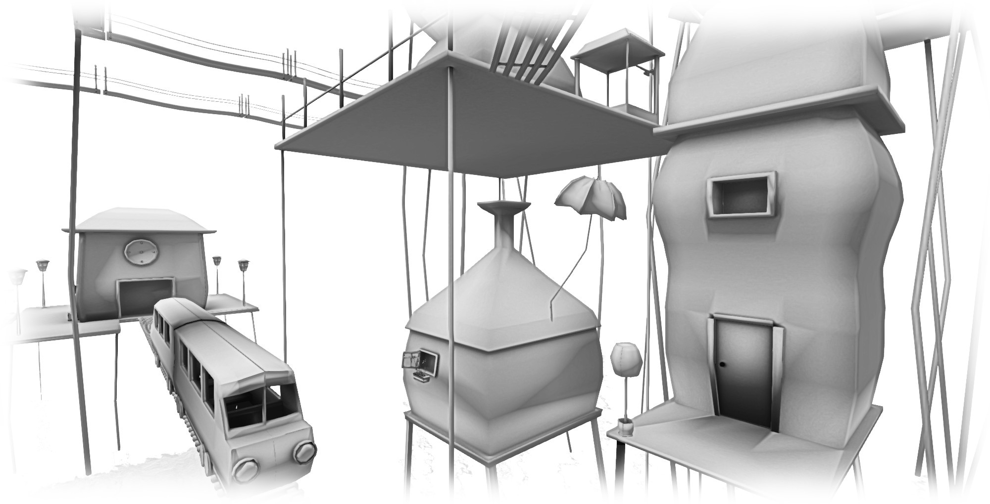 Visitors arrive in a land formed of greyscales. Colour seems to by almost entirely absent; tall slits, hinting at something overhead, rise from the surrounding grey/white water lapping at one’s ankles; a single set of step leading upwards to… nowhere, it would seem. However, climb the steps and an elevator will descend, offering you passage upwards to a multi-level town, precariously balanced atop the high stilts.