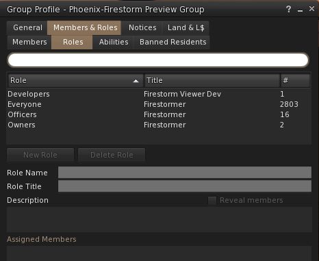 Opening the Members & Roles tab in the Group folder now defaults to displaying the Roles sub-tab, rather than Members. This change was requested by Linden Lab to help ease system performance problems caused by the viewer requesting (and re-requesting) large group members lists when the tab defaulted to Members.