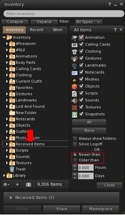 You can now display the Received itema pnael AND the Received Items folder (arrowed, left) in inventory, if you so wish Two new Inventory filter options – “Newer than” and “older Than” (circled)