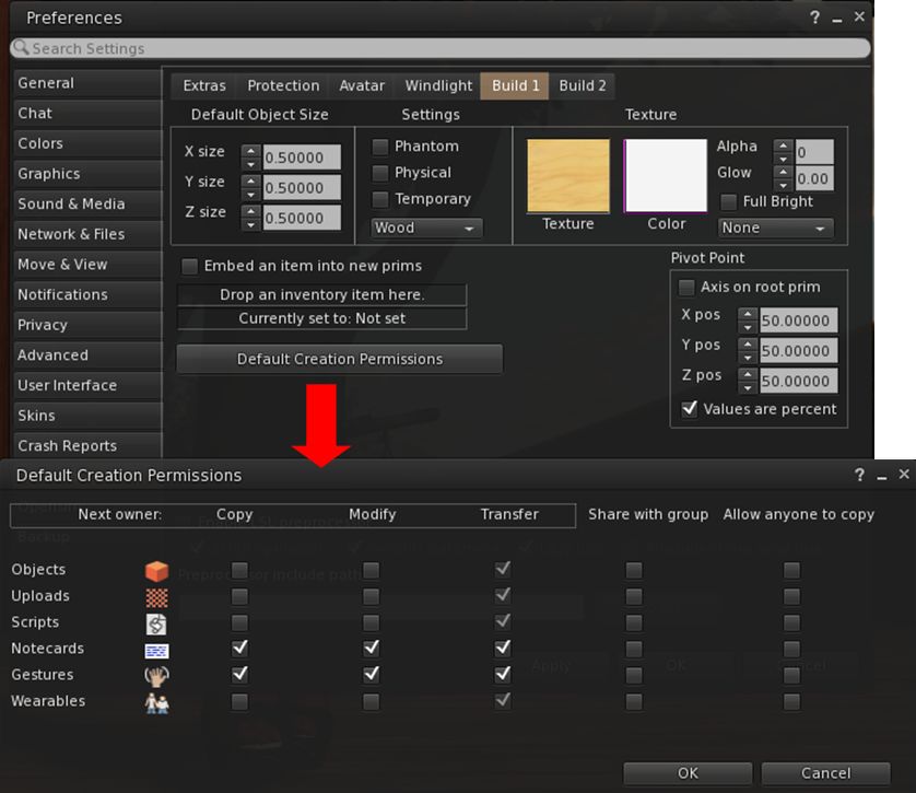Firestorm 4.7.1 includes the new default permissions panel for setting the initial permissions on created items – objects, uploads, scripts, notecards, gestures and wearables.  contributed to the official viewer by Jonathan Yap under STORM-68, the new panel can be opened via Preferences > Firestorm > Build 1 > Default Creation Permissions.