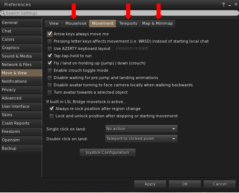Firestorm 4.7.1 sees the Preferences panel extensively overhauled, with revised tabs and updated / new sub-tabs, such as the new Mouselook, Teleports and Map & Minimap tabs under Movement