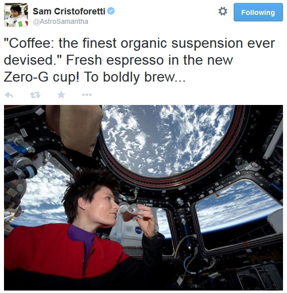 She later followed-up the Tweet with an image of her, still in her Star Trek uniform, enjoying that very first cup (yes cup – six special expresso cups were also flown up to the station as a part of an experiment into fluid dynamics which uses ISSpresso) of space-brewed expresso, complete with a suitable Trek quote (above).