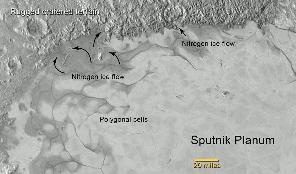 The best evidence found so far that the ice in and around “Sputnik Planum” has at some point been moving – and may still be moving, depending on what processes are at work on and within Pluto – has been found in the north-west of the region. This exhibits light and dark swirl-like patterns which, when seen on Earth or Mars, are indicative of flowing ice, such as with a glacier. On Pluto, these patterns seem to flow around surface obstacles and into depressions. In some areas, they appear to have broken through or over crater walls, slowly flowing into them. There is no way to directly tell if the ice is still in motion; however, it is a further pointer to Pluto having once been geologically active, and perhaps still being active today.