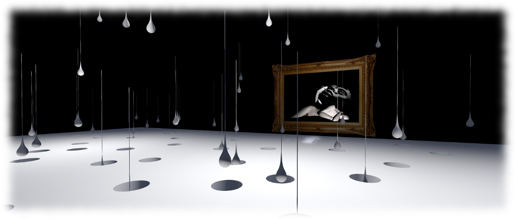 This room also features a sixth image, framed and hanging at the far end, relative to the landing point. This presents a dramatic study of a nude Terrygold standing within a room pock-marked with dimples in the floor, into which frozen drops of liquid appear to be falling, trailing long strands behind them, which disappear into the darkness overhead.