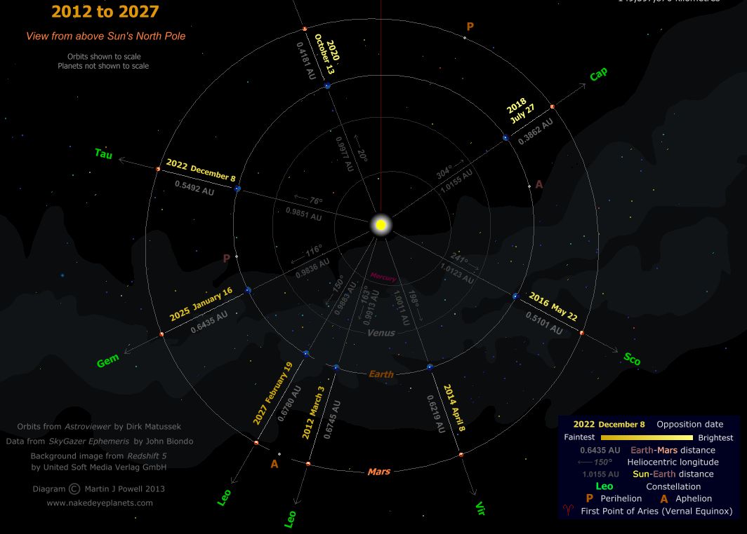 Opposition this year also coincides with a number of other notable events in Mars’ calendar. In April, the planet will enter a period of retrograde motion when seen against the backdrop of stars. This will see the planet apparently come to a stop in its eastward progress across the sky before travelling “backwards” for some two months, and then resuming its march eastwards once more. This is the result of the Earth – being closer to the Sun and orbiting it somewhat faster than Mars, periodically “catching up” and “overtaking” the Red Planet as each moves in their respective orbits.