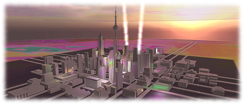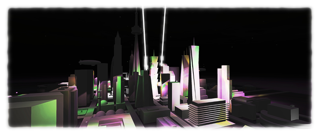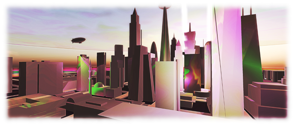 The City sits at the centre of the four regions, surrounded by the multi hued flat plain. To see this at its best, you will at least need to run your viewer with Advanced Lighting Model (ALM – Preferences > Graphics) enabled. This shouldn’t place too much of a performance load on older / less powerful systems, and it is necessary to have on in order to appreciate The City fully, with colours washing over the tall buildings and across the airships flying overhead.