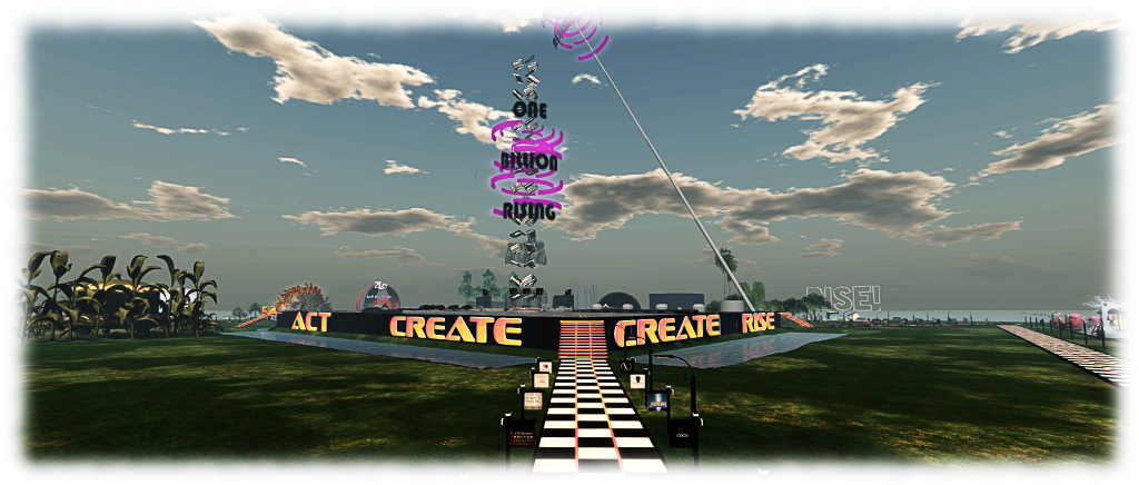 Activities in Second Life commence at 00:00 SLT on the morning of February 14th, and will continue through a full 24 hours across the four OBR regions of Listen, Rise, Create and Act. Around the central stage area located at the four adjoining corners of these regions, are art displays and information areas where people can learn about organisations around the world working to end violence against women.
