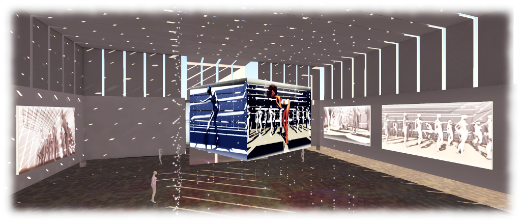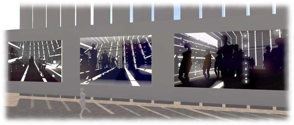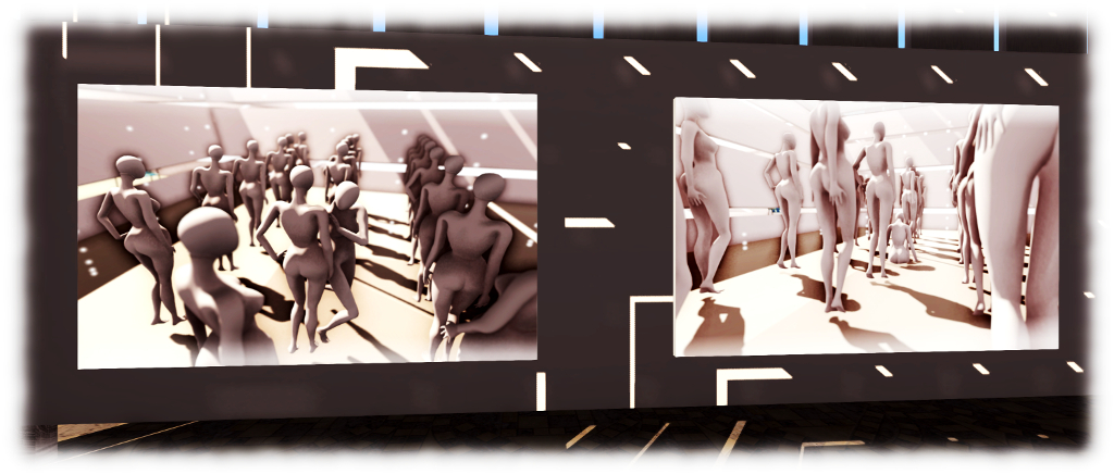 Around the walls of the gallery space are nine large format monochromatic pieces depicting uniform female mannequins all striking very similar poses to one another, with the exception of one individual, who is in a strikingly different pose. In a tenth image, which adds a subtle splash of colour, the single figure of an avatar hangs in repose, floating over the floor. Finally, over the central area of the gallery, a slowly rotating box displays two monochrome and two colour images of avatars, either alone or posing before the mannequin-like figures.