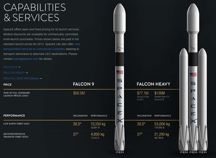 The Falcon 9 Heavy, which could lift scientific payloads aboard the Dragon 2 carrier vehicles almost anywhere in the solar system – compared to the current Falcon 9 (Credit: SpaceX)
