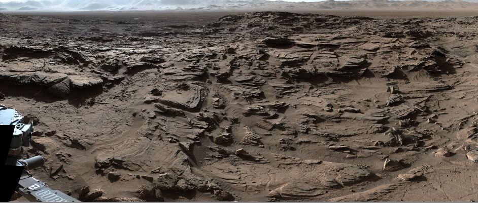 This work was completed in March, when the rover resumed its progress up the flank of the mound, climbing onto “Naukluft Plateau”, a roughly flat area cut into the side of “Mount Sharp” where aeons of wind erosion has carved the sandstone bedrock into ridges and knobs which were thought could offer a challenge for the rover in terms of wear and tear on the wheels.