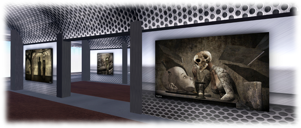 Many of the names behind the art on display will be familiar to regular exhibition goers: Silas Merlin, Giovanna Cerise, Toy Soldier Thor, Nino Vichan, Gem Preiz, Kayly Iali; others may be less familiar, but no less captivating in their art. In terms of the 2D art displayed, there is perhaps a lean towards art from the physical world being favoured for exhibition over art from “within” Second Life, such as avatar studies and SL landscapes. I asked Mickey if this was deliberate.